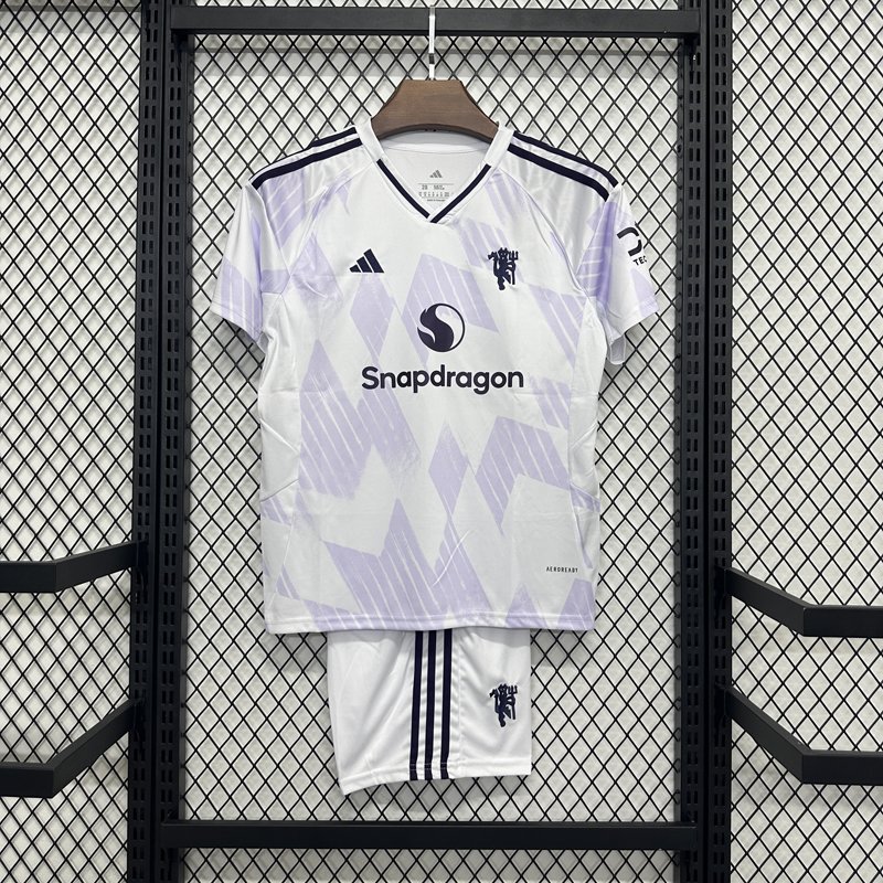 Echipamentul copii Manchester United 2025/26 deplasare include tricou și pantaloni inspirați din stilul legendar al anilor ‘90, cu un design geometric modern de tip „fulg de zăpadă” – o reinterpretare a celebrei echipări purtate în finala câștigată a Cupei Ligii din 1992. Pe piept se află emblema minimalistă cu diavolul roșu, simbol al pasiunii și loialității față de echipa de pe Old Trafford.