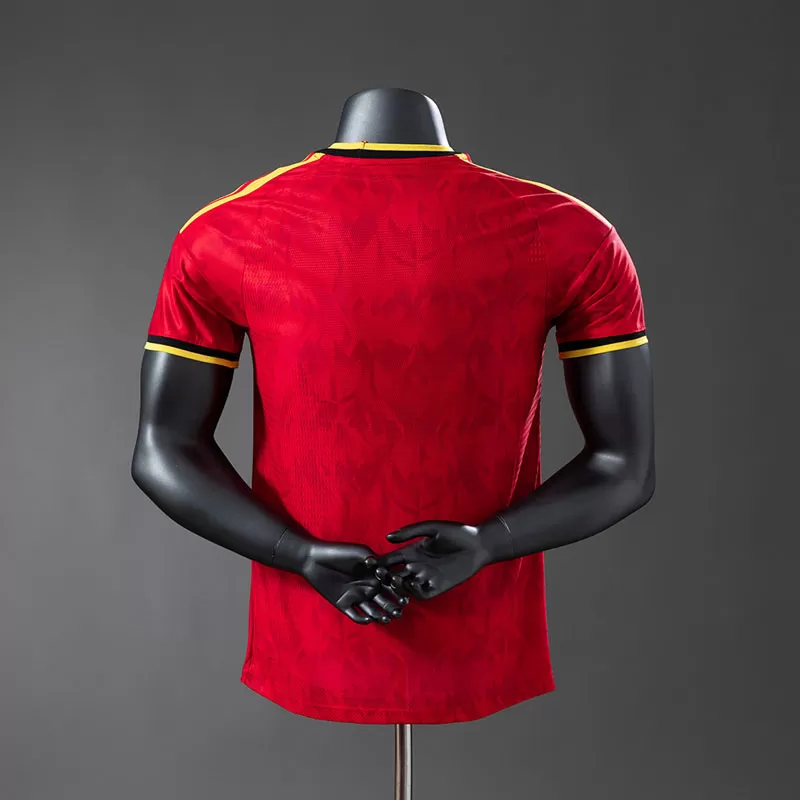 Echipamentul de fotbal Belgia acasă 2026 pentru bărbați aduce un design impunător, cu un roșu intens combinat cu detalii aurii și negre, inspirat de motivul „flăcările Diavolilor Roșii”. Modelul cu lalele și forme de foc conferă tricoului un aspect modern și plin de energie, perfect pentru fanii care vor un tricou fotbal Belgia 2026 confortabil și stilat pentru Cupa Mondială 2026.
