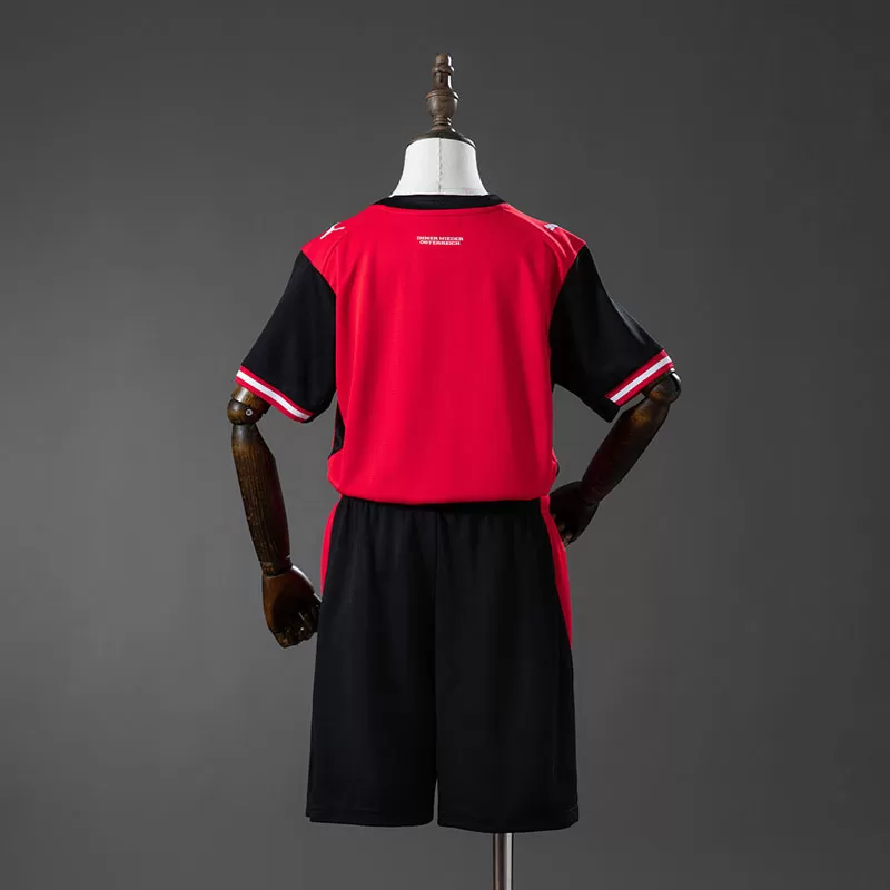 Descoperă Echipament Austria 2026 acasă pentru copii – tricou fotbal + pantaloni set, alegerea ideală pentru micii suporteri care caută un echipament fotbal copii modern și confortabil. Acest tricou Austria 2026 copii impresionează prin designul clasic în roșu, completat de mâneci negre și detalii inspirate din culorile drapelului, oferind un look puternic și ușor de recunoscut.