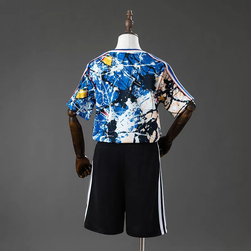 Tricoul are un look contemporan, influențat de simboluri vizuale iconice, fiind completat de pantaloni scurți asortați pentru un set complet fotbal copii. Este ideal atât pentru antrenament, cât și pentru purtare casual, oferind un stil unic pentru orice mic suporter.