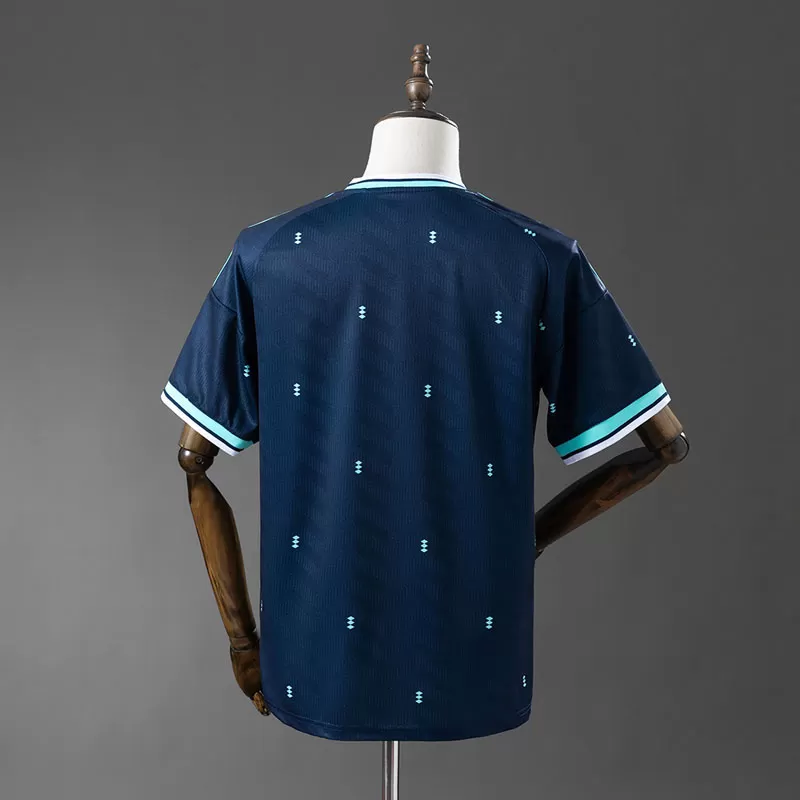 Pregătește-te pentru Cupa Mondială cu noul echipament fotbal Germania 2026 deplasare, o alegere perfectă pentru fanii adevărați ai naționalei. Tricoul are o bază bleumarin elegantă, completată de logo-uri albe și detalii în nuanțe de mentă, oferind un aspect modern și rafinat. Modelul cu dungi în zig-zag și accentele tricolore alb/bleumarin/mentă la guler și manșete adaugă un plus de stil și originalitate.