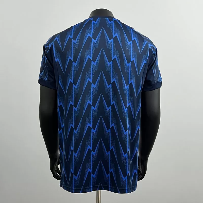 Tricoul de fotbal pentru bărbați Arsenal 2025/26 model de deplasare impresionează printr-un design spectaculos și modern. Fundalul bleumarin închis este evidențiat de un model grafic vibrant cu fulgere în albastru regal, inspirat de echipamentul legendar purtat în sezonul 1995-1996.